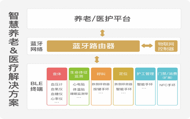 3、数据传输自动化,老人用户体验好。蓝牙路由器采集数据后自动上传到养老平台,省去了老人使用手机APP连接各类BLE医疗器械的麻烦。同时,BLE设备的低功耗特性,一方面为老人省去了频繁充电的麻烦,另一方面蓝牙辐射只有日常手机通话的万分之一,对身体更加安全。