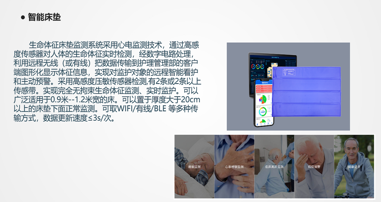 生命体征监测床垫是在非拘束的情况下测定人体的体征信息,适用于人体呼吸、心率等生命体征的辅助监测,及人体在床/离床状态的显示和报警等。