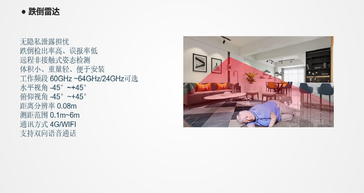智康护跌倒检测雷达作为非接触式监护保障了用户隐私,全程无感式,不会泄露画面图像音频,隐私场景下的传感技术实现老年人的跌倒检测。